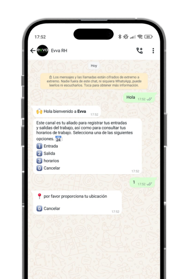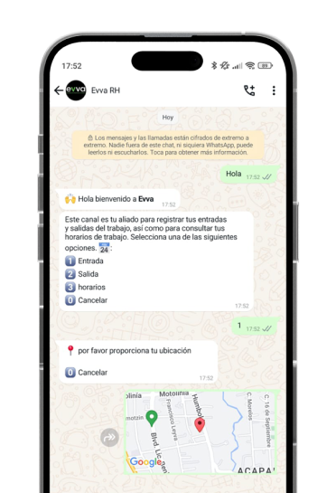 Registra las entradas, pausas y salidas de tu equipo con un solo clic. Utiliza la familiaridad de WhatsApp para que tu equipo registre su asistencia sin complicaciones. Obtén datos del reloj checador en tiempo real y realiza el seguimiento desde Evva. Los registros geolocalizados te permitirán conocer la ubicación precisa de tus colaboradores y establecer un radio de acción.